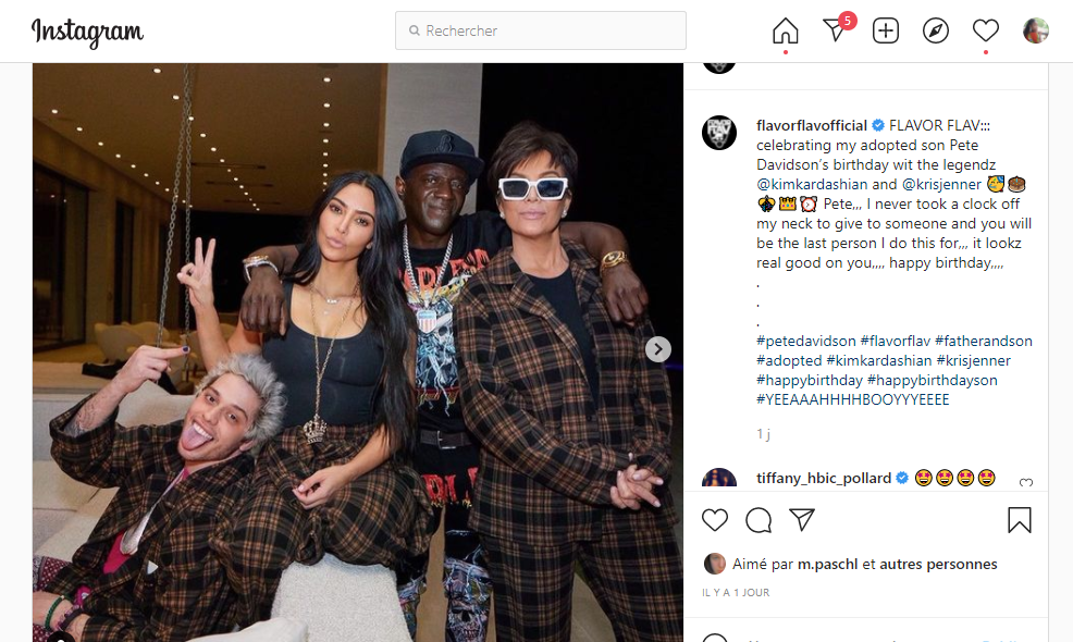« FLAVOR FLAV ::: célébrant l’anniversaire de mon fils adoptif Pete Davidson avec les legendz @kimkardashian et @krisjenner. « Pete ,,, je n’ai jamais enlevé une horloge de mon cou pour donner à quelqu’un et tu seras la dernière personne pour qui je fais ça ,,, ça te va vraiment bien ,,,, joyeux anniversaire », a écrit Flavour Flav en légende de la photo.