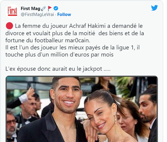 La nouvelle de la cession des biens de Hakimi à sa mère a été annoncée par First Mag jeudi au soir. Le média soutenait que Hiba Abouk aurait réclamé au tribunal la moitié de la fortune de son mari dans le cadre du divorce. Mais aux dernières nouvelles, cette information à polémique qui secoue la toile est une fake news.