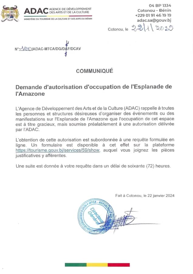 L’Agence de Développement des Arts et de la Culture (ADAC) a instauré de nouvelles règles pour l’occupation de l’Esplanade de l’Amazone, un lieu emblématique de Cotonou.