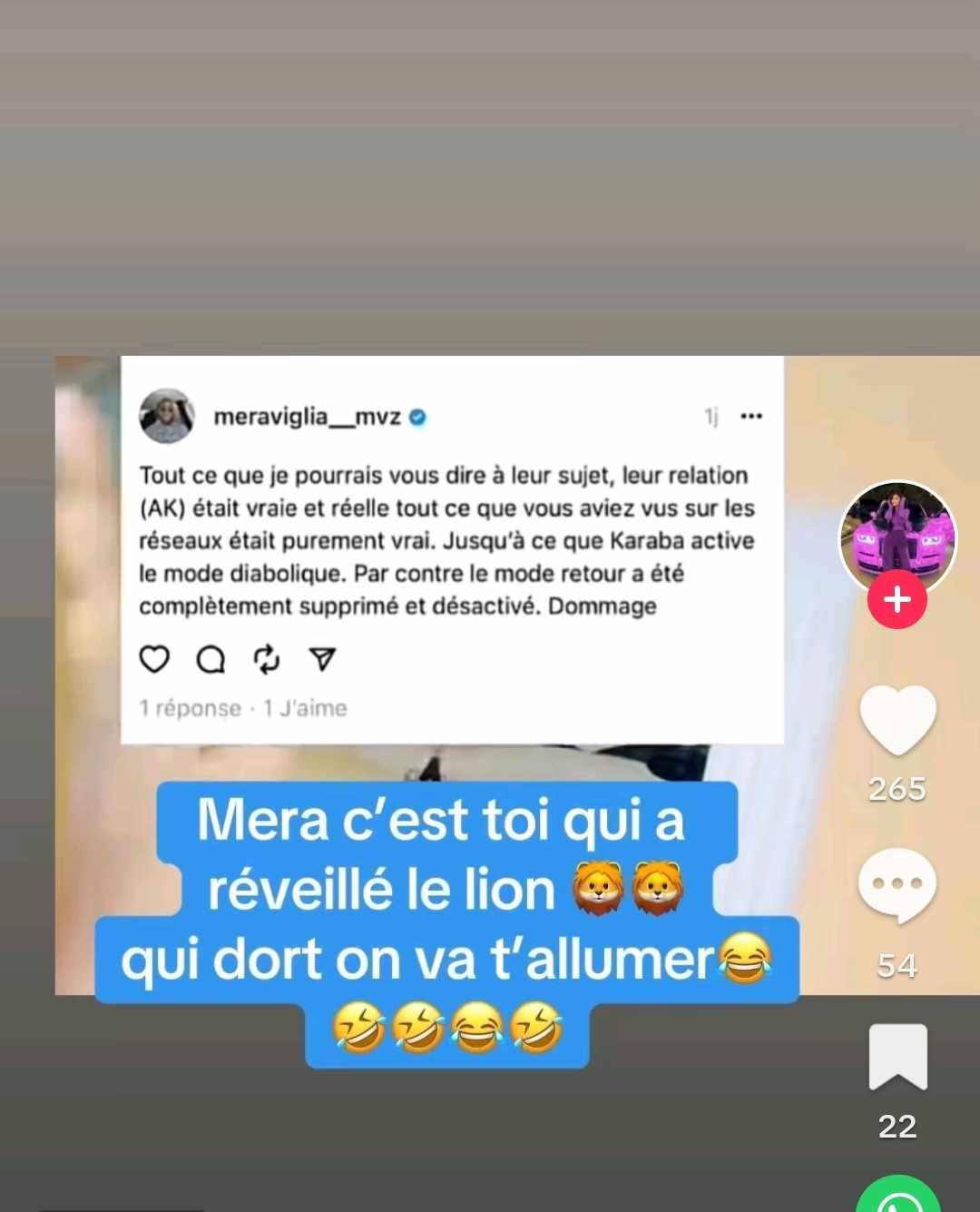 « Tout ce que je pourrais vous dire à leur sujet leur relation (AK était vraie et réelle, tout ce que vous aviez vu sur les réseaux sociaux était purement vrai.Jusqu’à ce que Karaba active le mode diabolique. Par contre le mode retour a été complètement supprimé et désactivé. Dommage. », a écrit Papa Mera qui n’a pas épargné Lolo Beauté.