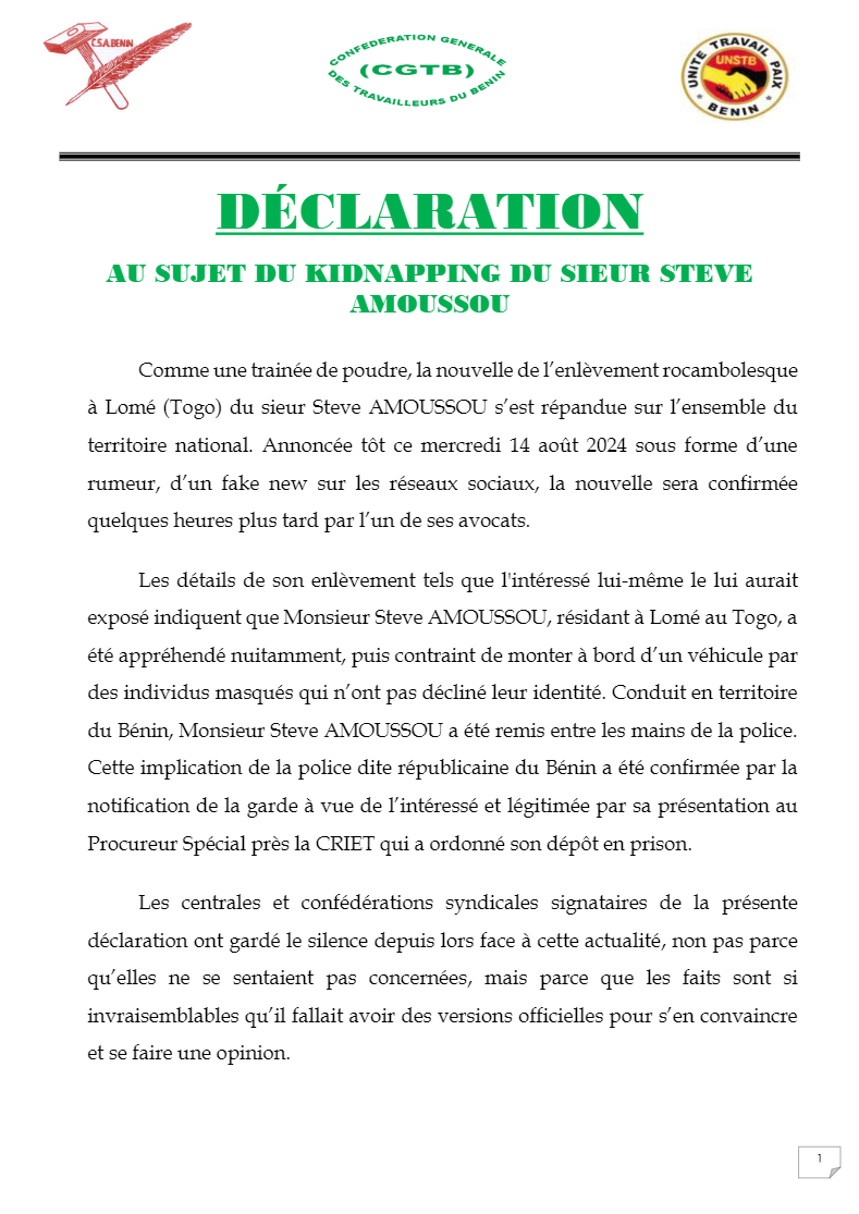Au Bénin, trois centrales et confédérations syndicales, la CSA-Bénin, la CGTB et l’UNSTB réagissent à l’enlèvement de Steve Amoussou dans la nuit du lundi 12 août à Lomé au Togo.