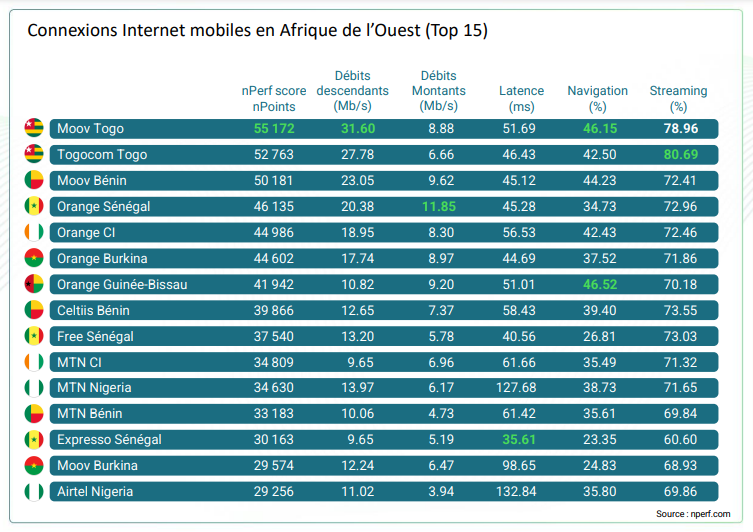 « Les débits descendants de Moov Africa Togo et de Togo Cellulaire ont été les meilleurs en 2023 avec respectivement 31,6 Mb/s et 27,8 Mb/s, contre 23,1 Mb/s pour Moov Africa Bénin, 20,4 Mb/s pour Orange Sénégal, 19 Mb/s pour Orange Côte d’Ivoire et 3 Mb/s pour Telecel Burkina Faso« , lit-on dans le rapport.