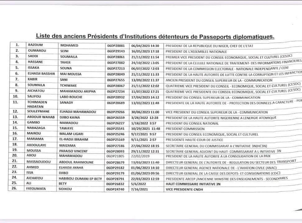 La mesure concerne des personnalités qui ne sont plus en possession du passeport diplomatique nigérien. Il s’agit des anciens Présidents d’Institutions, anciens ministres, anciens députés nationaux, anciens Conseillers et Conseillers Spéciaux à la Présidence, à l’Assemblée nationale et à la Primature. D’autres personnalités nigériennes et non nigériennes sont également concernées.