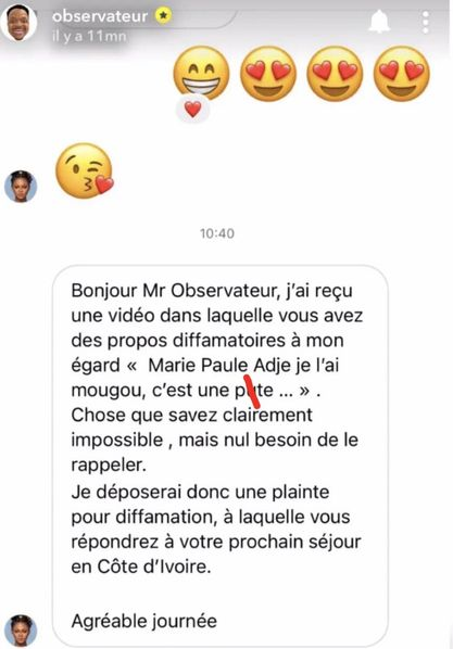 Dans son message, Marie Paule Adje a annoncé son intention de déposer une plainte pour diffamation, ajoutant : « Je déposerai une plainte pour diffamation, à laquelle vous répondrez à votre prochain séjour en Côte d’Ivoire. », peut-on lire sur la capture d’écran partagée par Observateur Ebene.