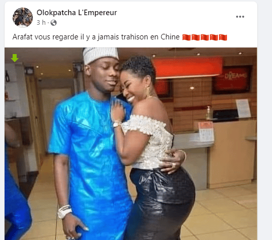 Et pourtant, lors d’une conférence de presse, le chanteur malien n’a pas fait dans la dentelle pour affirmer que Carmen Sama est sa femme. « Carmen Sama, c’est ma femme», a-t-il lâché telle une bombe. Pour Olopkatcha, c’est une blague de très mauvais goût. « Arafat vous regarde il n’y a jamais trahison en Chine», a-t-il mis en légende d’un cliché de Sidiki Diabaté et Carmen Sama.
