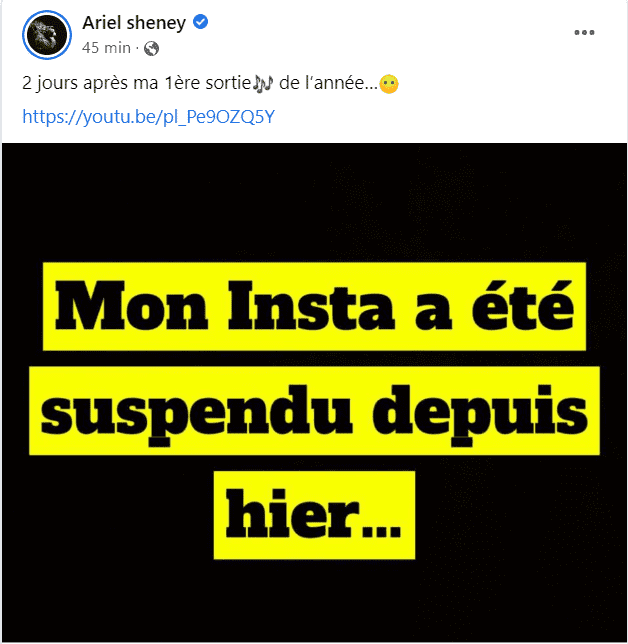 En pleine promotion de sa nouvelle chanson, intitulée « Toffole », Ariel Sheney a partagé la triste nouvelle, ajoutant que ce fâcheux incident se produit au moment inopportun. « Mon compte Instagram a été suspendu, depuis hier (vendredi 9 septembre 2022, NDLR). », a informé l’artiste.
