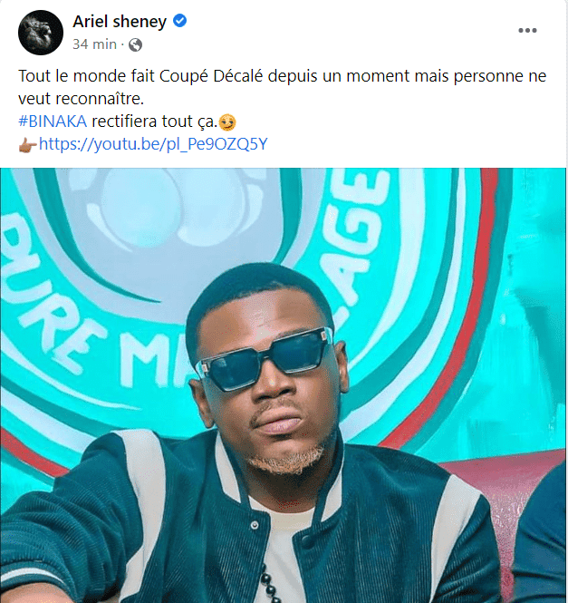 En effet, dans la matinée du vendredi 30 septembre dernier, Ariel Sheney a subtilement taclé les acteurs du monde de la musique ivoirienne, dans une publication. A l’en croire, ces derniers feraient du Couper-Décaler sans toutefois l’assumer. Il a même ajouté que certains artistes se plaisent à dire couramment qu’ils font de la variété, pourtant leurs productions s’apparentent bien aux sonorités Coupé Décalé.