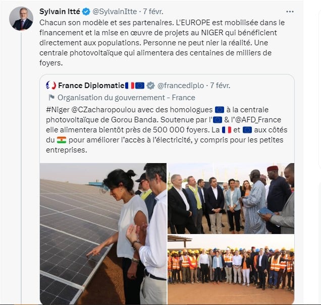 Pour mieux informer sur les réseaux sociaux de la réalisation, l’ambassadeur de la France auprès de la République du Niger a partagé la publication sur sa page Twitter. Et de commenter « Chacun son modèle et ses partenaires. L’EUROPE est mobilisée dans le financement et la mise en œuvre de projets au NIGER qui bénéficient directement aux populations. Personne ne peut nier la réalité. Une centrale photovoltaïque qui alimentera des centaines de milliers de foyers. »