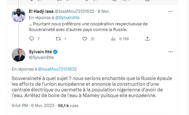 Et comme une réponse du berger à la bergère, M. Sylvain Itté est revenu à la charge, et cette fois-ci, pour déverser tout son venin sur Twitter. « Souveraineté à quel sujet ? nous serions enchantés que la Russie épaule les efforts de l’union européenne et annonce la construction d’une centrale électrique ou permette à la population nigerienne d’avoir de l’eau. Arrêtez de boire de l’eau à Niamey puisque elle européenne. »