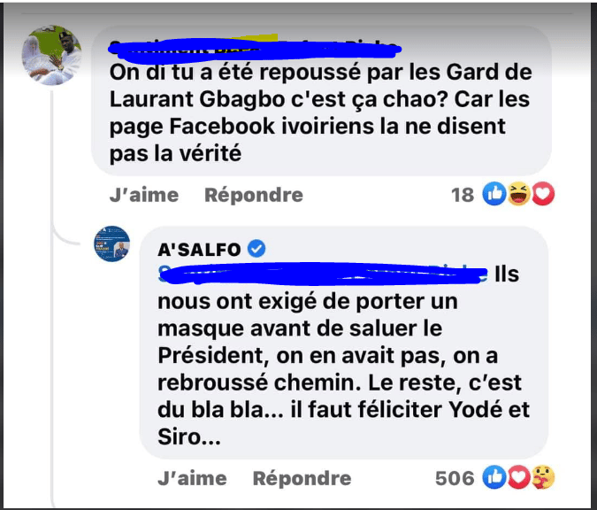 « On dit que tu a été repoussé par les gardes de Laurent Gbagbo », a écrit un internaute en targuant l’artiste. Et comme il s’est si bien le faire, A’Salfo n’a pas tardé à répondre. ” Ils nous ont exigé de porter un masque avant de saluer le Président, on n’en avait pas, on a rebroussé chemin. Le reste, c’est du bla bla… il faut féliciter Yodé et Siro…”, a clarifié l’artiste.