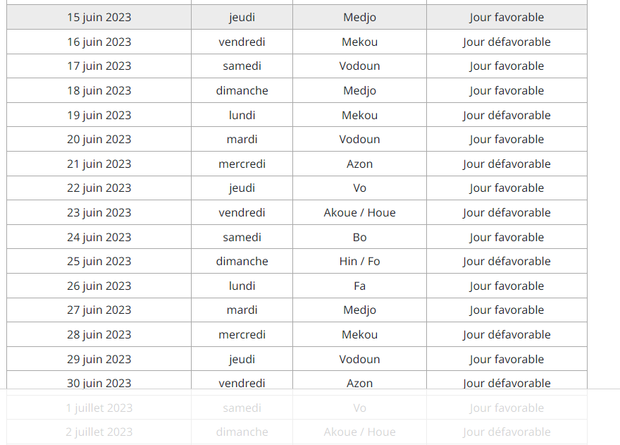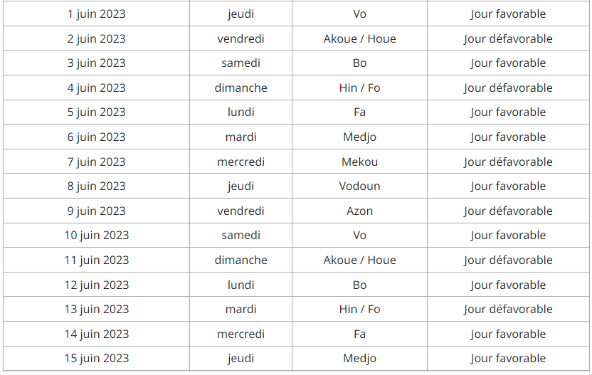 Ces jours peuvent être favorables ou défavorables pour les prises de décisions et de réalisations de certains projets de vie comme: le mariage, le voyage, l’emménagement, une cérémonie, une entreprise, une relation, …) Retrouvez ci-dessous celui du mois de juin 2023.