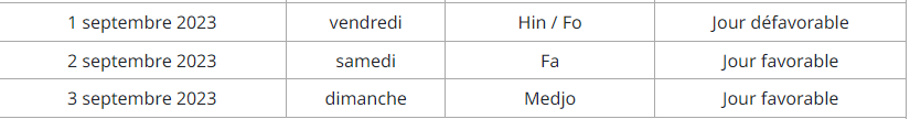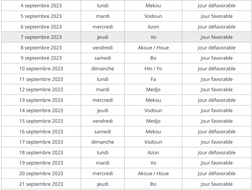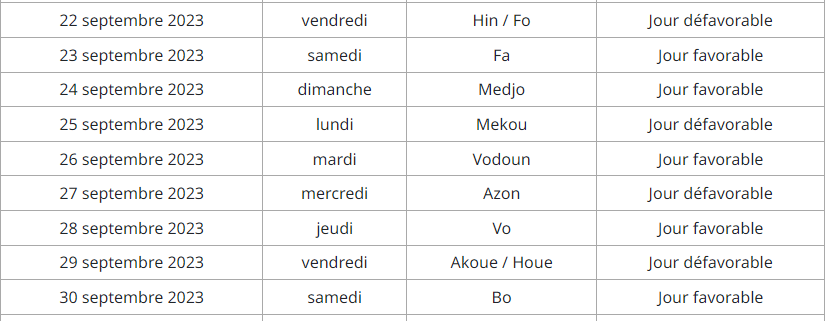 Le Fêzan est un calendrier ancestral basé sur l’apparition lunaire. Il décrit l’essence de la vie de l’homme sur terre. Composé de neuf (09) jours et telle une boussole, il vous oriente et éclaire dans le choix au mieux des jours correspondant pour chaque évènement et moment de la vie. Découvrez celui du mois de septembre 2023 ici.