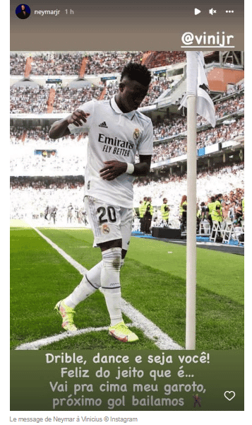 Dans un message publié sur son compte Instagram, l’attaquant du PSG a écrit: « Dribble, danse, sois toi-même ! Heureux comme tu es. Prochain but on danse mon garçon ! » Une attention qui a fait plaisir à Vini qui a répondu « toujours », avec en prime une photo de lui, Neymar et Lucas Paqueta en train de danser durant un match de la sélection brésilienne.