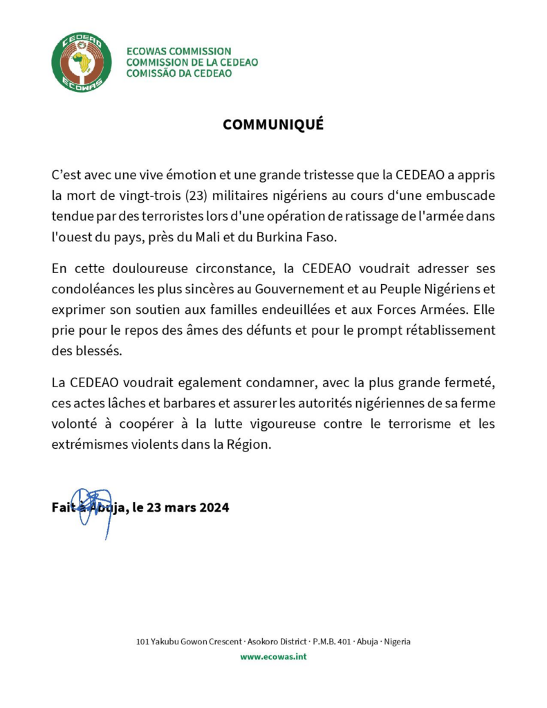 La CEDEAO a exprimé ses condoléances aux familles des 23 militaires décédés dans une embuscade djihadiste survenue dans la région de Tillabéri, entre mercredi et jeudi.