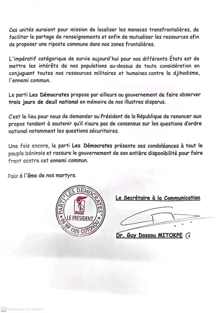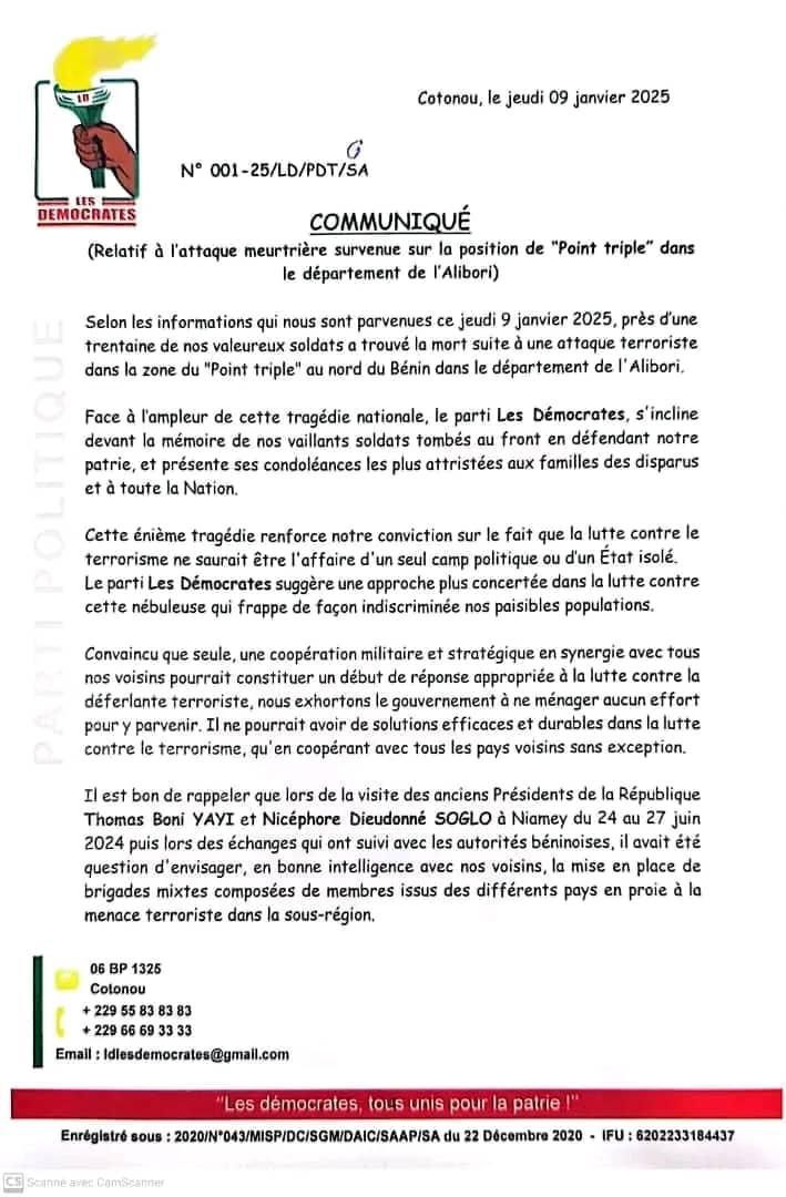 À la suite de l’attaque meurtrière survenue dans la nuit du mercredi 8 janvier 2025 au “Point Triple” dans le département de l’Alibori, le parti politique “Les Démocrates” a exprimé, dans un communiqué officiel, sa profonde solidarité avec les familles des victimes et son hommage aux soldats tombés en défendant la patrie.