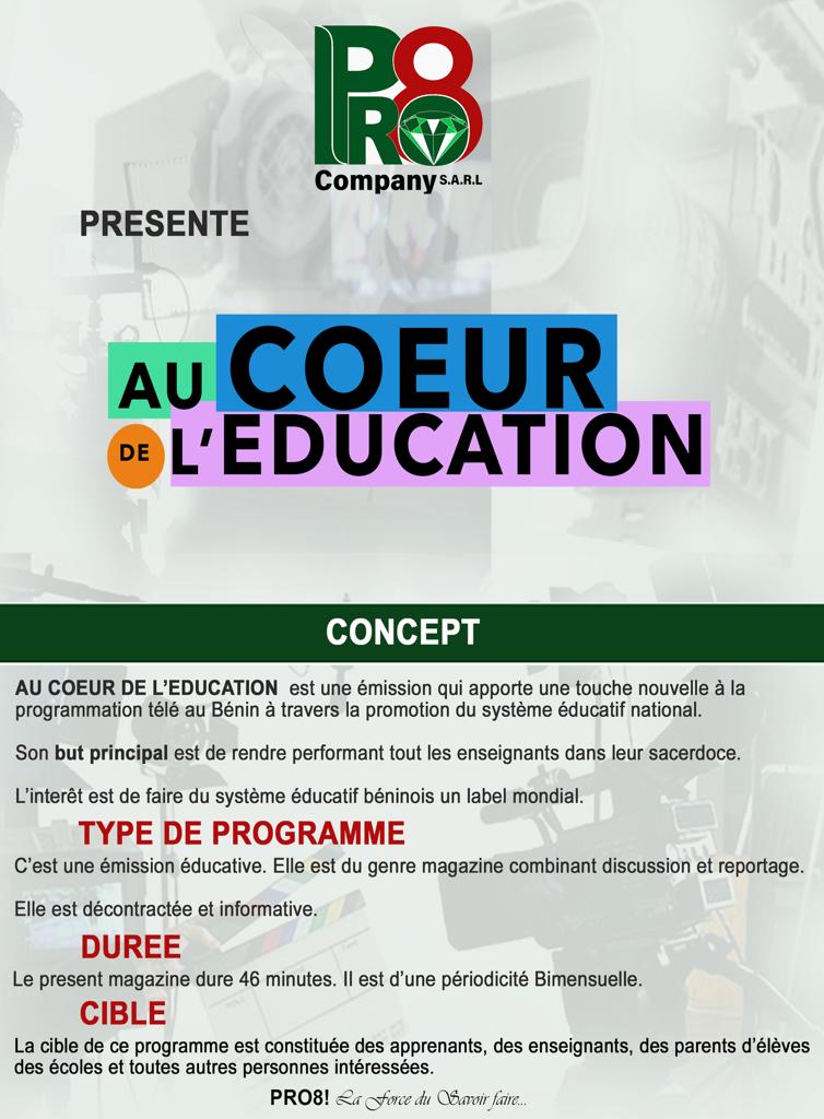 Pro8 Company (Agence de communication, de production audiovisuelle et d’événementiel) propose aux téléspectateurs, internautes et auditeurs béninois une nouvelle émission intitulée « Au cœur de l’éducation ». Comme l’indique son nom, l’objectif de cette émission est de faire du système éducatif Béninois béninois un label mondial.