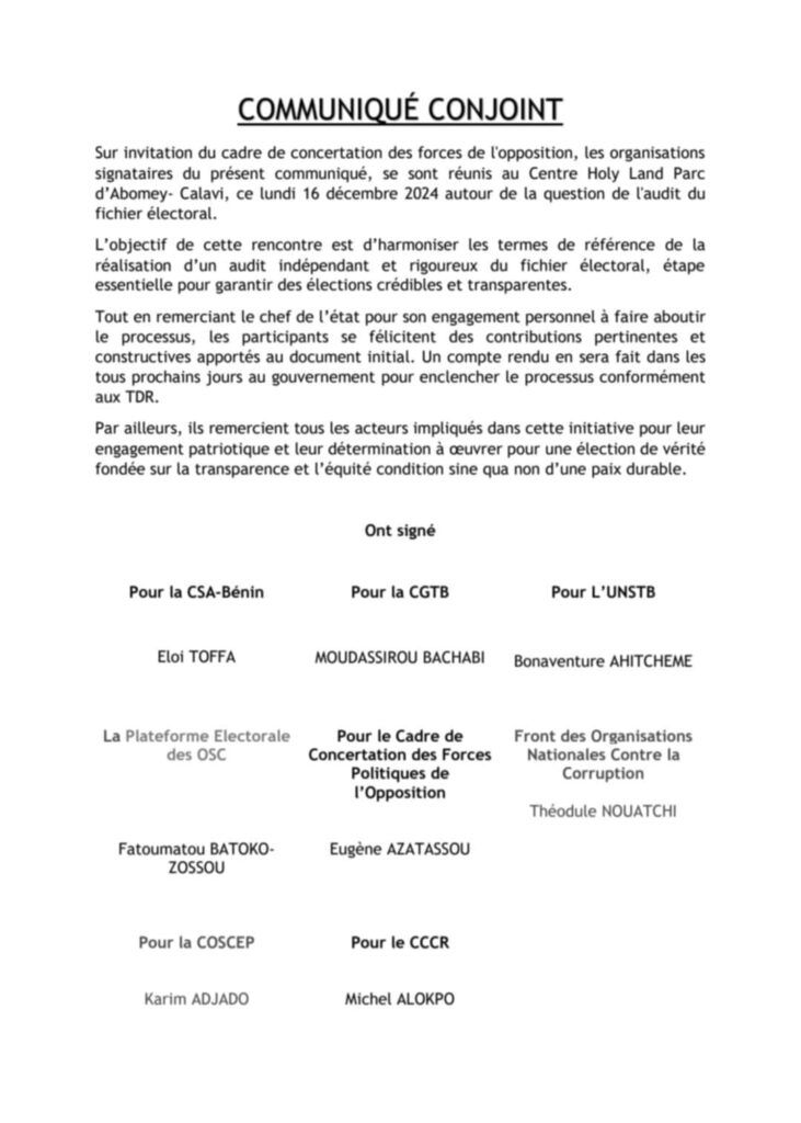 Le Cadre de Concertation des Forces Politiques de l’Opposition a tenu une réunion le 16 décembre 2024 à Holy Land Parc à Abomey-Calavi pour faire le point des échanges avec les partis politiques et les confessions religieuses autour du projet de l’audit du fichier électoral.