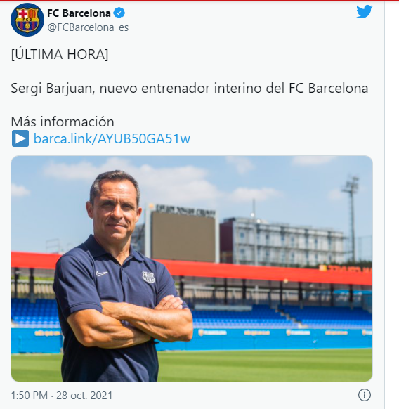 « Sergi Barjuan, nuevo entrenador interino del FC Barcelona (Sergi Barjuan , nouveau entraineur par intérime du FC Barcelone », a annoncé le club sur Twitter.