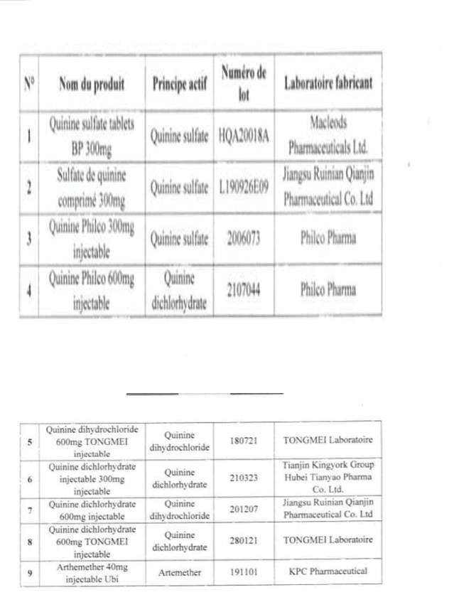 Toutes les officines pharmaceutiques et établissements sanitaires sont invités à mettre embargo sur les produits incriminés, consignés dans le tableau ci-dessous.