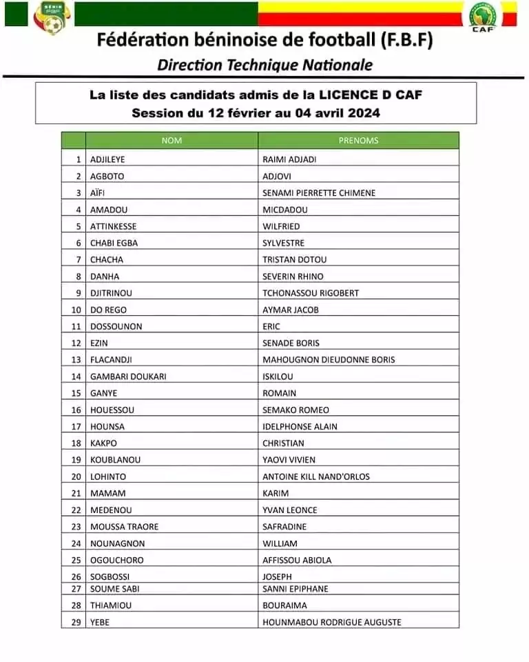 Parmi les lauréats, certains visages familiers se distinguent déjà, à l’instar de Sévérin Danha, qui occupe actuellement le poste d’entraîneur des sélections scolaires U15 et U18 du Bénin. Leur réussite souligne la diversité des profils et la richesse des compétences présentes dans le pays.