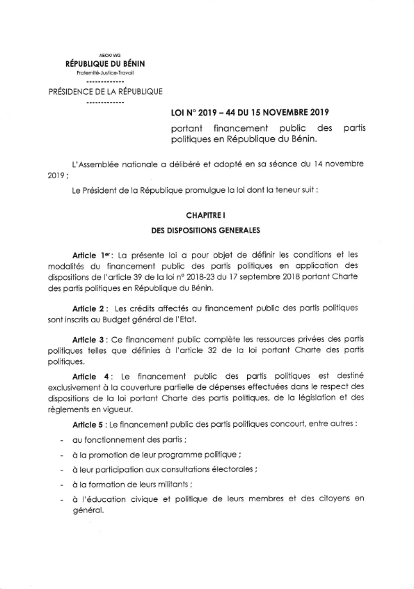 Les autres articles précisent la clé de répartition. Lire ci-dessous l’essentiel à retenir de la loi n° 2019-44 du 15 novembre 2019 portant financement public des partis politiques en République du Bénin.