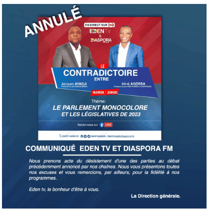 Le principe de ce débat contradictoire avait été accepté parce qu’au cours de cet entretien, il a été attribué à notre Président de soi-disant propos faisant état de ce que, dans une précédente émission, le Président aurait justifié le caractère non monocolore du parlement actuel par la présence d’une majorité et d’une minorité. Or, dans le spot annonçant le débat contradictoire pour ce jour mardi 19 Avril 2022, la rédaction de EDEN TV a eu l’honnêteté de passer un extrait des véritables propos du Président sur le sujet qui n’a rien à voir avec ce qui a été dit et commenté lors de l’entretien. Dès lors, ce débat est devenu sans objet, donc inopportun pour le parti Moele-Bénin.