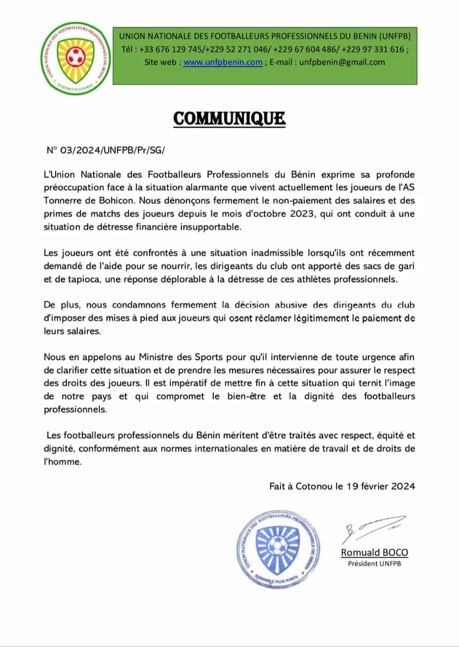 «il est impératif de mettre fin à cette situation qui ternit l’image de notre pays et qui compromet le bien-être et la dignité des footballeurs professionnels (…) Les footballeurs professionnels du Bénin méritent d’être traités avec respect, équité et dignité, conformément aux normes internationales en matière de travail et de droits de l’homme« , a conclu le syndicat dans sa correspondance adressée à aux dirigeants d’AS Tonnerre, à la fédération béninoise de football, et au Ministère des Sports.