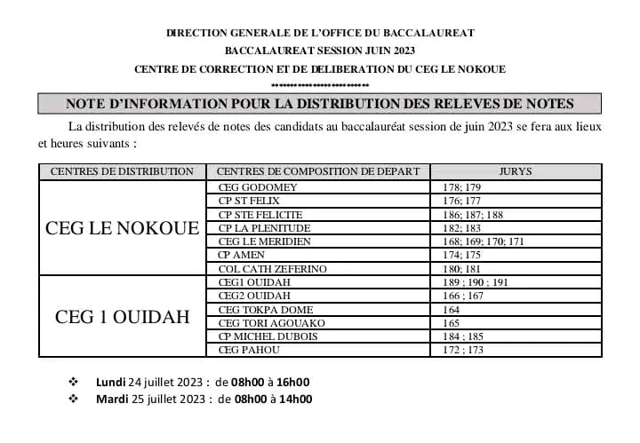 La distribution des relevés démarre le lundi 24 juillet 2023 dans les centres de correction et de délibération. Au Ceg Le Nokoué et au Ceg 1 Ouidah, les candidats sont attendus le lundi de 8 h à 16h et le mardi de 8h à 14h, selon un planning établi.