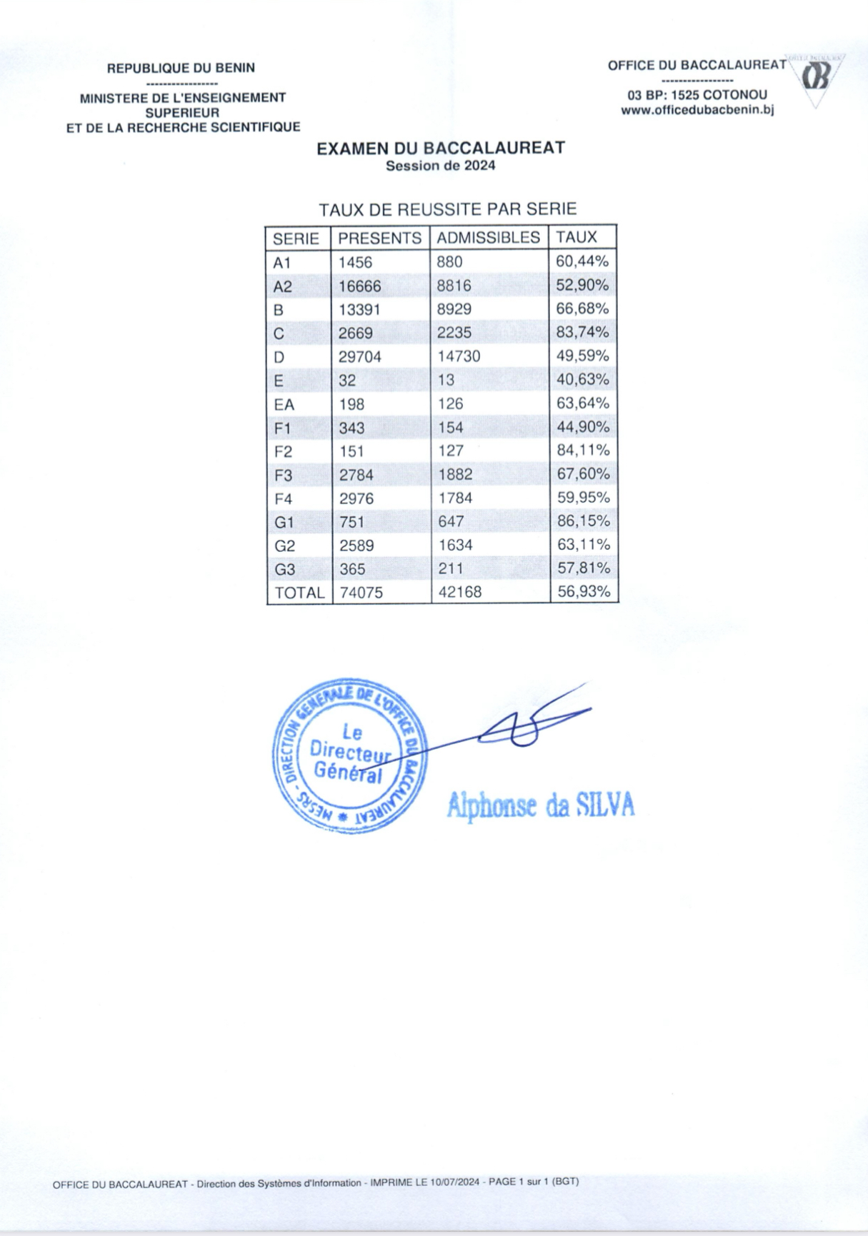 Selon les chiffres communiqués par le Directeur général de l’Office du BAC, Alphonse da Silva, l’examen a donné un taux de réussite de 56,93% au plan national. Les chiffres au niveau des séries portent la G1 en tête avec 86,15%. La lanterne rouge est gardée par la série E avec un taux de 40,63%