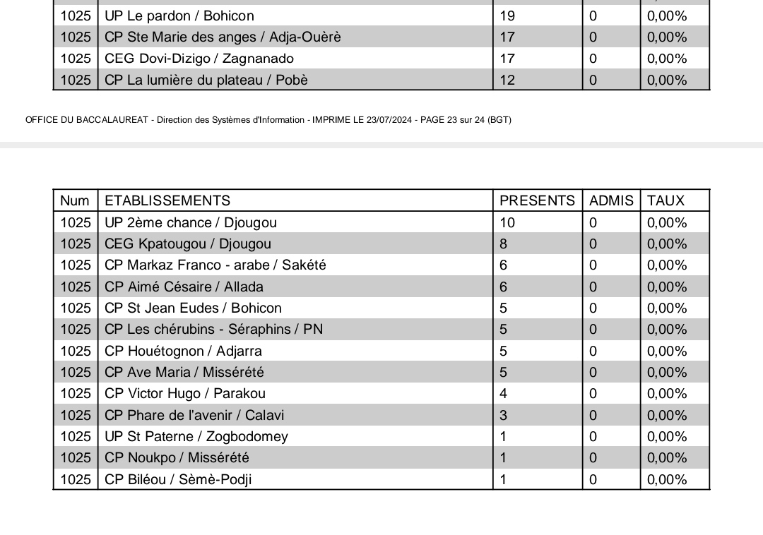 Bénin – BAC 2024 : liste des 17 établissements ayant obtenu 00% de réussite