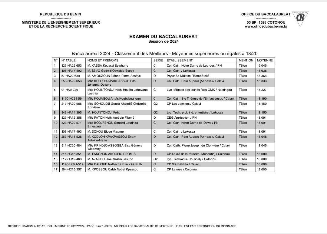 Bénin – BAC 2024 : liste des 17 meilleurs candidats et leurs collèges de provenance