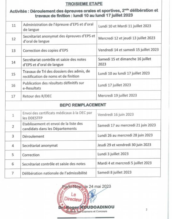 Selon le calendrier, les candidats seront accueillis dans les centres selon la série (ML, MC) les lundi 10 et mardi 11 juillet. Les travaux de Secrétariat vont se poursuivre pour aboutir aux résultats définitifs sur la plateforme E-Resultats le lundi 17 juillet 2023.