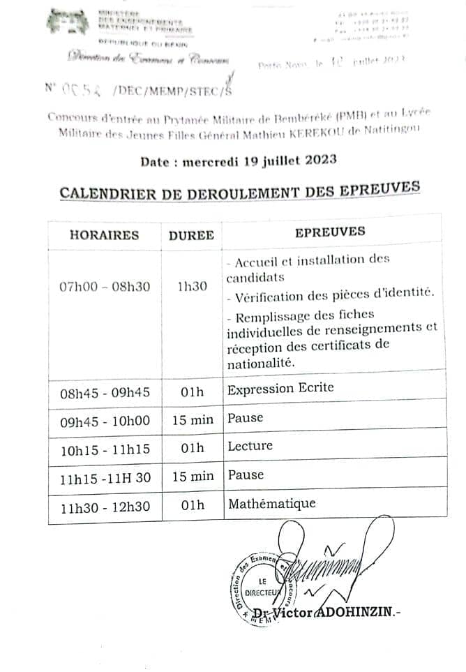 Après les résultats du Certificat d’Etude Primaire (Cep), la Direction des examens et concours (Déc) lance le concours d’entrée au Prytanée militaire de Bembéréké et au Lycée militaire des jeunes filles Général Mathieu Kérékou de Natitingou.