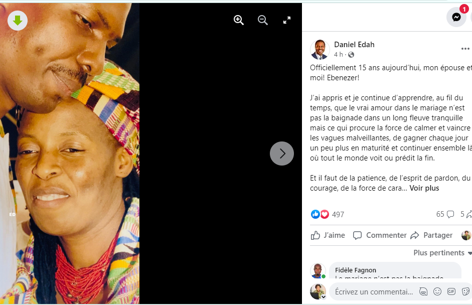 « Officiellement 15 ans aujourd’hui, mon épouse et moi! Ebenezer! », a annoncé Daniel Edah ce mardi 21 mars 2023. Selon lui, le vrai amour dans le mariage n’est pas la baignade dans un long fleuve tranquille mais dit-il « ce qui procure la force de calmer et vaincre les vagues malveillantes, de gagner chaque jour un peu plus en maturité et continuer ensemble là où tout le monde voit ou prédit la fin ».