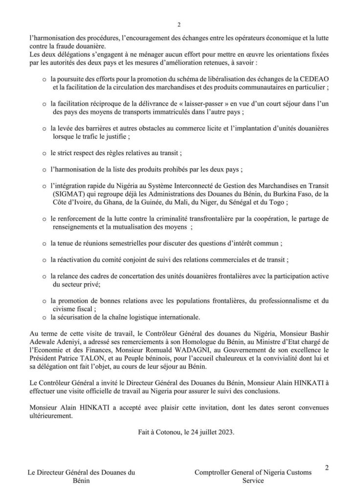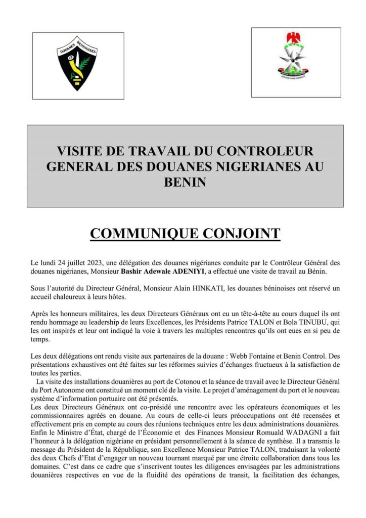 Communiqué conjoint à la suite de la visite de Bashir Adewale Adeniyi, DG douanes du Nigéria, au Bénin. La visite s’est déroulée ce lundi 24 juillet 2023.