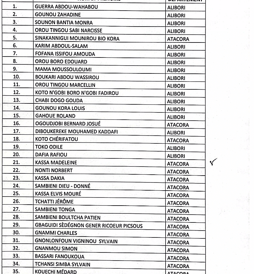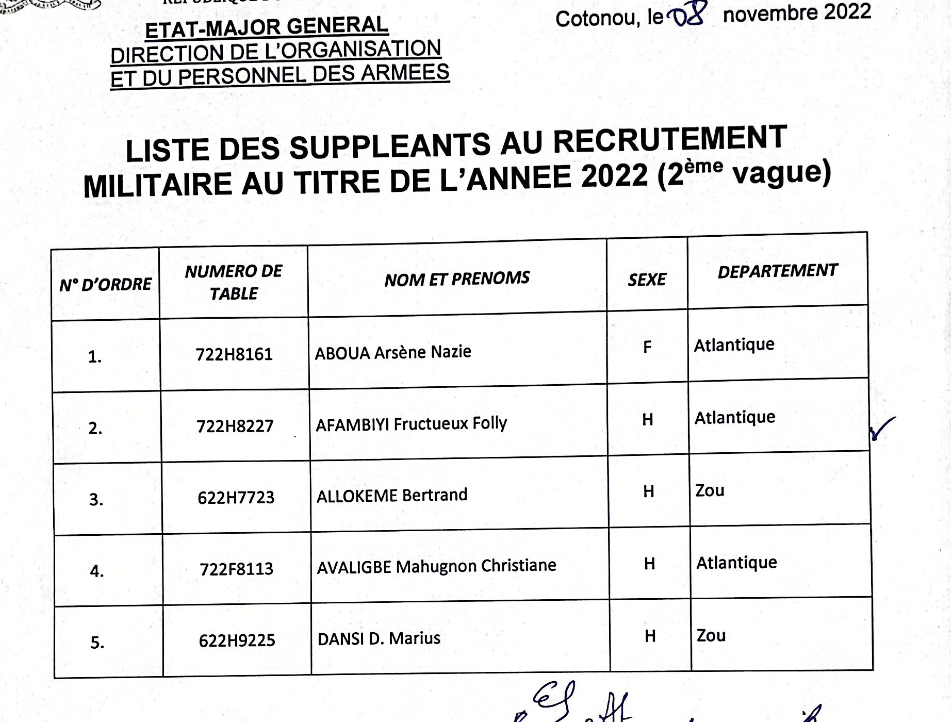 Les 40 candidats retenus pour cette phase sont invités à se présenter, le jeudi 10 novembre 2022 à 06H 00 au Centre Médico-Social (CMS) de la Garnison de Cotonou pour les candidats des départements de l’Atlantique, du Littoral, du Mono, du Couffo, de l’Ouémé, du Plateau et du Zou et à l’Hôpital d’Instruction des Armées de Parakou (HIA-PARAKOU) pour les candidats des départements de l’Atacora, du Borgou, de l’Alibori, des Collines et de la Donga.