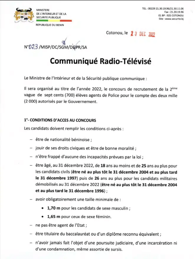 A noter que pour le compte de cette 2e vague de recrutement, 700 élèves agents de la police seront recrutés pour le renforcement de l’effectif de la Police républicaine. La première vague avait abouti au recrutement de 2000 élèves agents de la police pour la même cause.