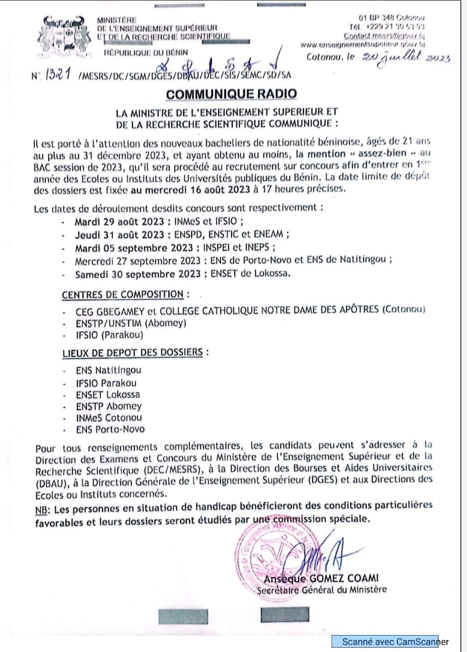 Dans le cadre de la rentrée scolaire et académique 2023-2024, il est ouvert à l’attention des nouveaux bacheliers, le recrutement sur concours afin d’accéder aux écoles ou aux instituts des universités publiques. Le concours est ouvert aux bacheliers de nationalité béninoise, âgés de 21 ans au plus et ayant obtenu au moins la mention assez bien à l’examen du baccalauréat session de Juin 2023.