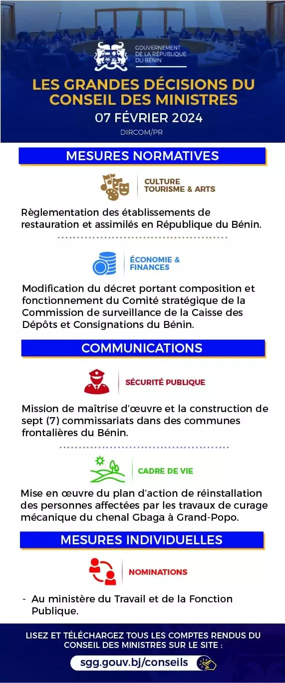 Bénin-Conseil des Ministres: les grandes décisions du mercredi 07 février 2024