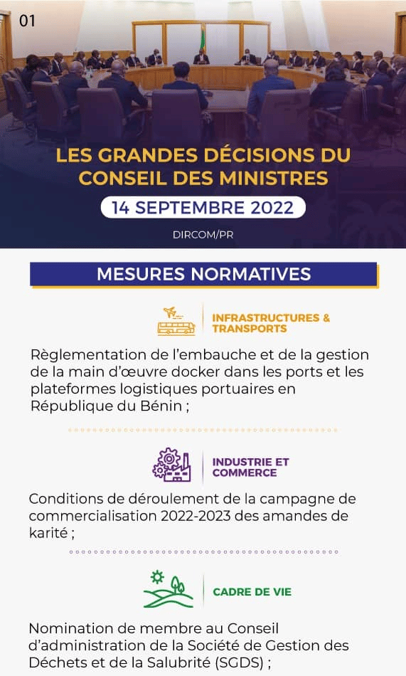 Bénin-Conseil des ministres: les grandes décisions du mercredi 14 septembre 2022