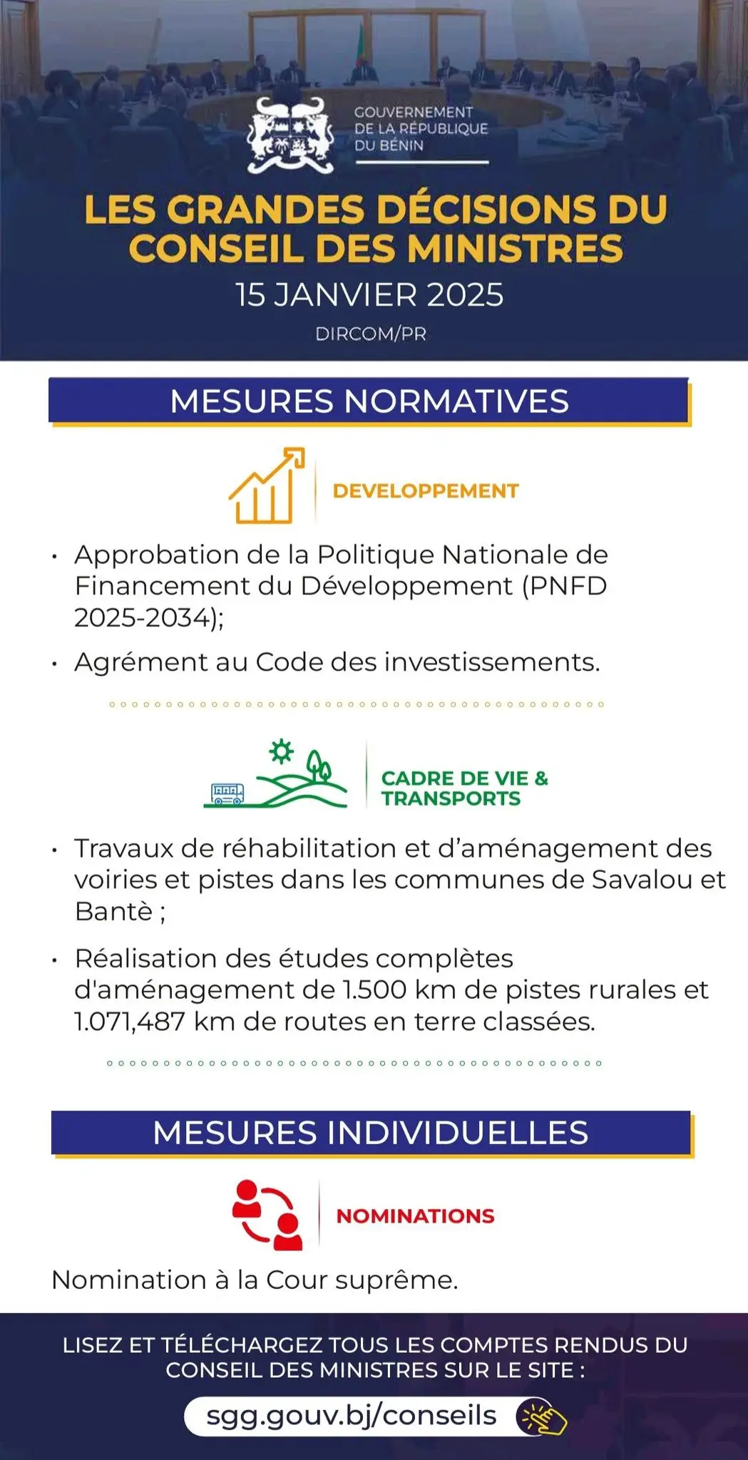 Bénin – Conseil des ministres: les grandes décisions du mercredi 15 janvier 2025