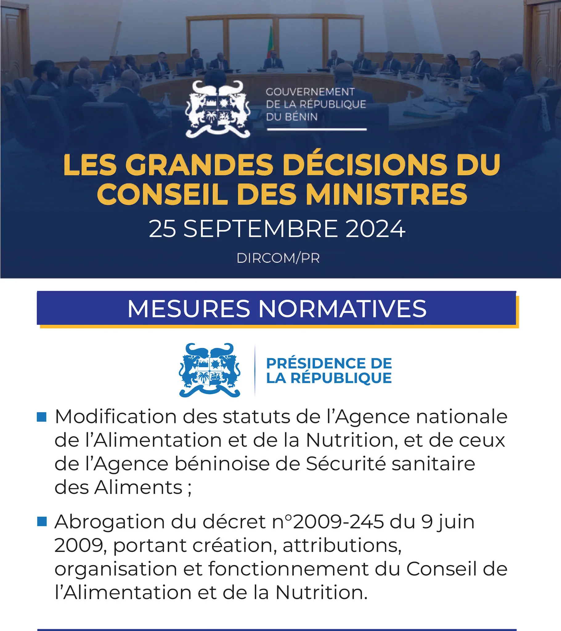 Le Gouvernement du Bénin s’est réuni une fois encore ce mercredi 25 septembre 2024 sous la présidence effective de Patrice Talon. Beaucoup de décisions ont été prises, dont en voici les grandes lignes