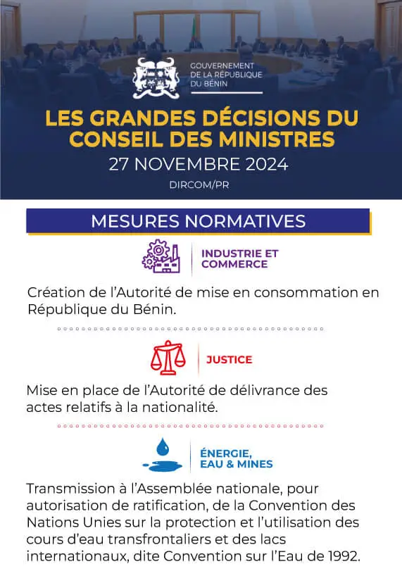 Les membres du gouvernement du Bénin ont tenu leur conseil des ministres ordinaire une fois encore ce mercredi 27 novembre 2024. Lors de cette rencontre, beaucoup de décisions ont été prises. Retrouvez ici les grandes lignes.