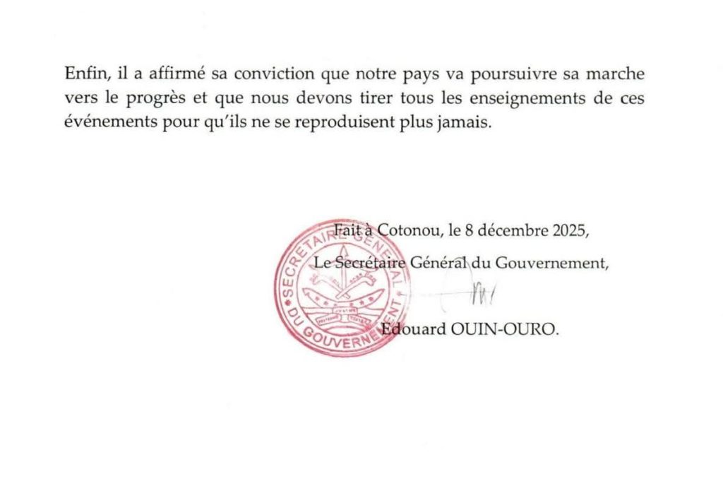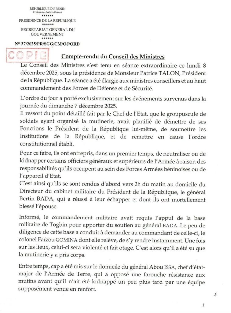 Lors d’un conseil extraordinaire des ministres convoqué ce lundi 8 décembre 2025, le gouvernement a dévoilé dans les moindres détails le film de la tentative de coup d’État manquée survenue le dimanche 7 décembre 2025. Trouvez ci-dessous le scénario tel que déroulé par les putschistes.