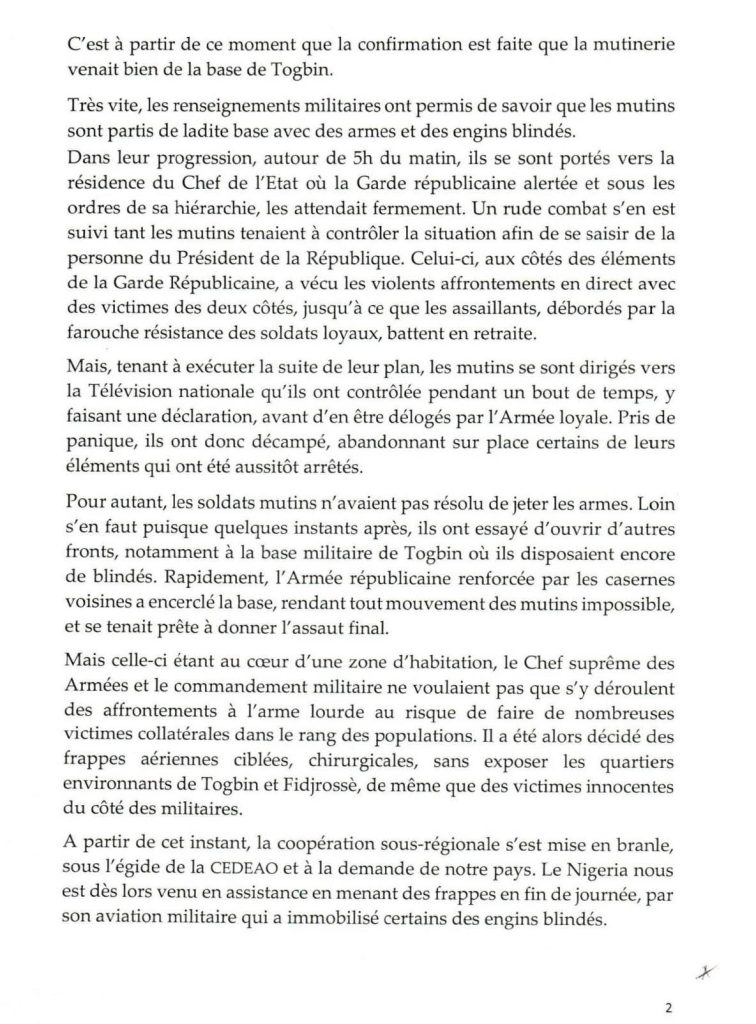 Il ressort du point détaillé fait par le Chef de l’Etat, que le groupuscule de soldats ayant organisé la mutinerie, avait planifié de démettre de ses fonctions le Président de la République lui-même, de soumettre les Institutions de la République, et de remettre en cause l’ordre constitutionnel établi.