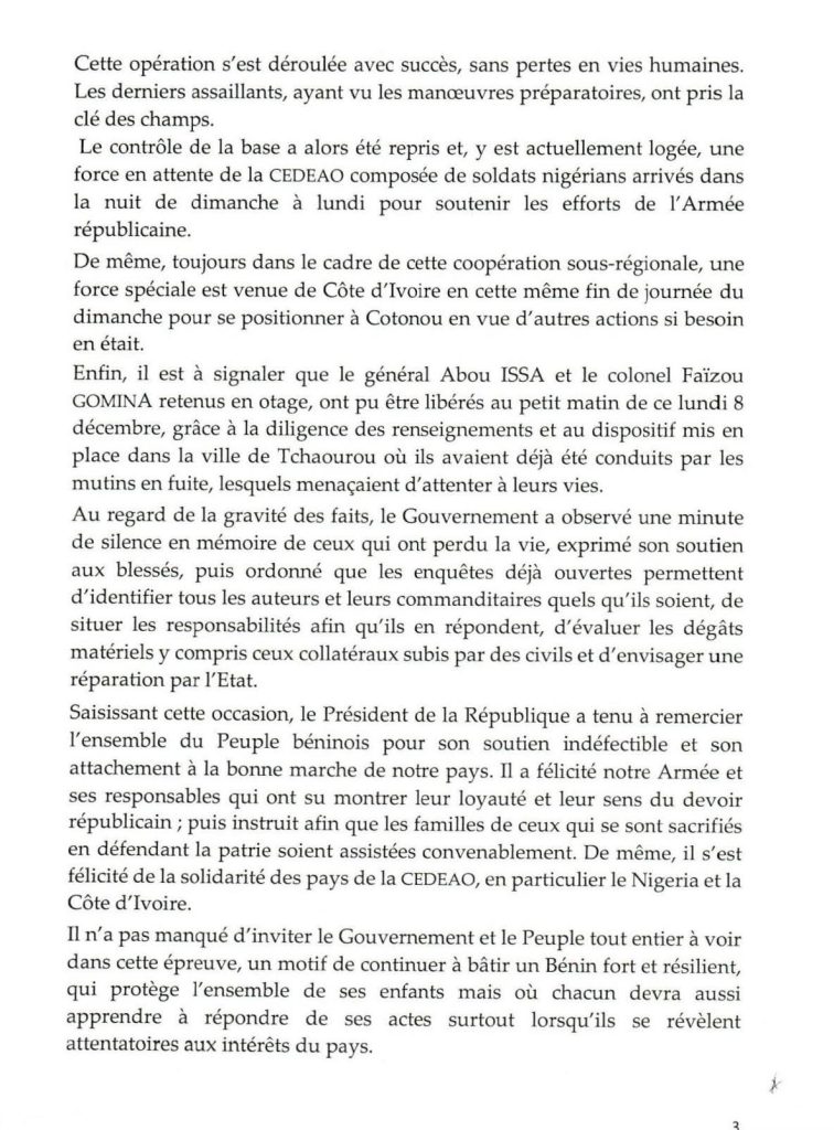 Saisissant cette occasion, le Président de la République a tenu à remercier l’ensemble du Peuple béninois pour son soutien indéfectible et son attachement à la bonne marche de notre pays. Il a félicité notre Armée et ses responsables qui ont su montrer leur loyauté et leur sens du devoir républicain ; puis instruit afin que les familles de ceux qui se sont sacrifiés en défendant la patrie soient assistées convenablement. De même, il s’est félicité de la solidarité des pays de la CEDEAO, en particulier le Nigeria et la Côte d’Ivoire.