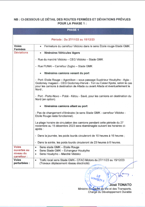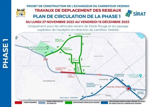 En prélude au démarrage des travaux de construction d’un échangeur au carrefour Vêdoko, il sera procédé au déplacement des réseaux d’électricité, d’eau et de télécommunication afin de libérer les emprises du projet. A cet effet, des perturbations seront observées dès le lundi 27 novembre 2023 au niveau des voies d’accès du projet.