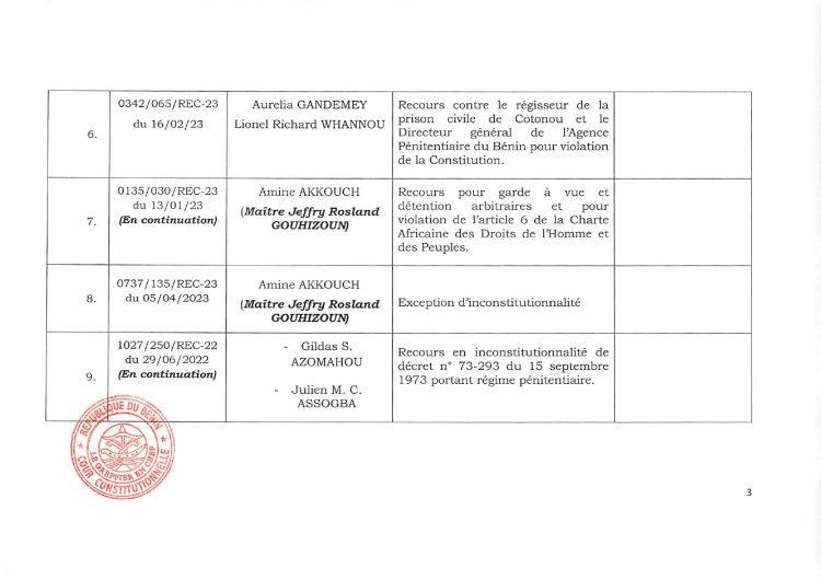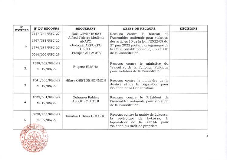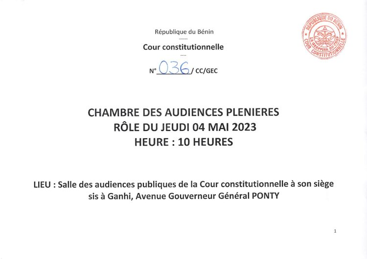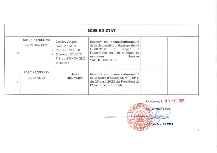 Le recours du ministre de l’ancien ministre Hervé Hêhomey qui demande à la haute juridiction de déclarer contraire à la constitution la lettre N° 0232/AN/PT/SP-C du 25 avril 2023 du Président de l’Assemblée nationale, Louis Gbehounou Vlavonou sera examiné le jeudi 4 mai 2023 par les conseillers de la Cour constitutionnelle. C’est l’un des dossiers qui figurent au rôle de cette audience plénière qui connaitra au total onze dossiers. Voir ci-dessous l’intégralité des dossiers inscrits au rôle.