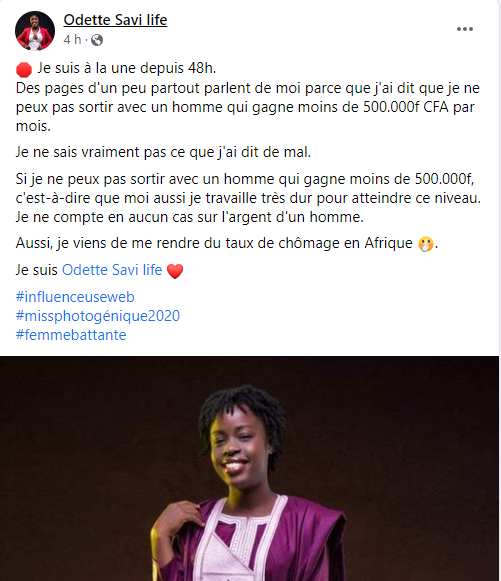 Largement critiqée sur les réseaux sociaux, Odette Savi a tenté d’expliquer son message. « Je suis à la une depuis 48h. Des pages d’un peu partout parlent de moi parce que j’ai dit que je ne peux pas sortir avec un homme qui gagne moins de 500.000f CFA par mois », a-t-elle indiqué.