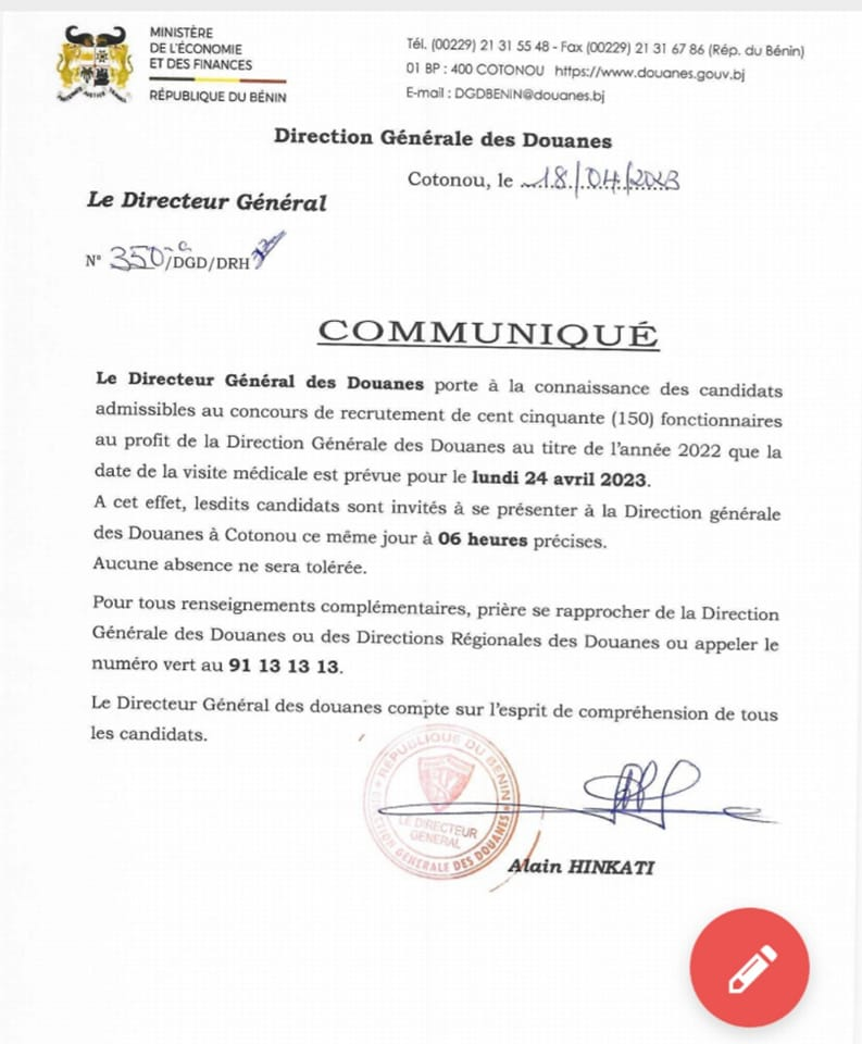Bénin: date et lieu de la visite médicale pour le concours douane